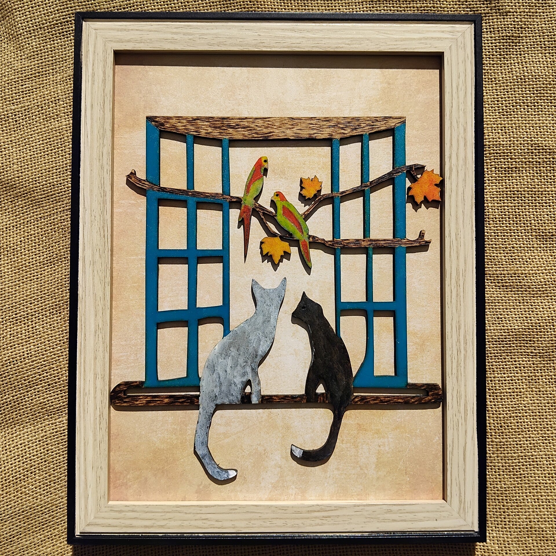 Chat fenêtre en tilleul découpé et pyrogravé à la main