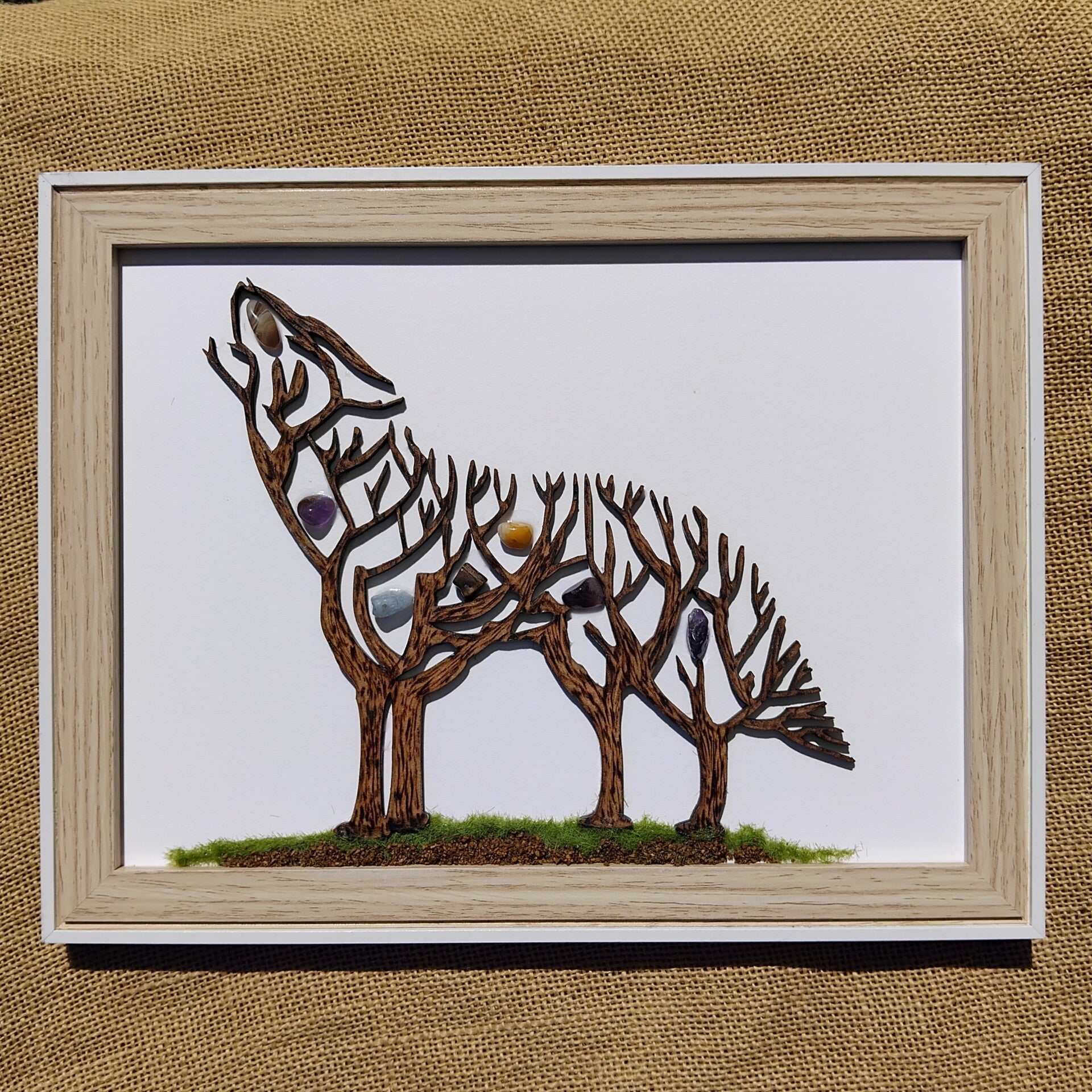 Le loup est en tilleul représentant l ́arbre de vie découpé puis pyrogravé à la main